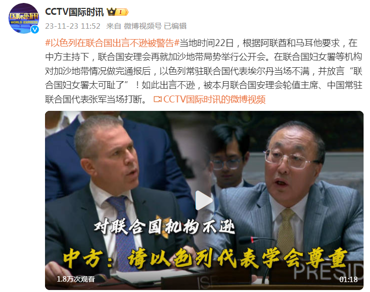 当地时间22日,根据阿联酋和马耳他要求,在中方主持下,联合国安理会再就加沙地带局势举行公开会。在联合国妇女署等机构对加沙地带情况做完通报后,以色列常驻联合国代表埃尔丹当场不满,并称“联合国妇女署太可耻了”!如此出言不逊,被本月联合国安理会轮值主席、中国常驻联合国代表张军当场打断。