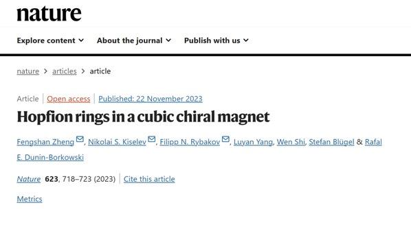 突破性发现!华南理工大学郑风珊教授联合德国于利希研究中心Nikolai S. Kiselev博士和瑞典乌普萨拉大学Filipp N. Rybakov博士等学者,共同在晶体中直接观察到磁霍普夫子(Hopfion)。相关成果以“Hopfion rings in a cubic chiral magnet”为题发表在国际学术期刊《自然》(Nature)上。