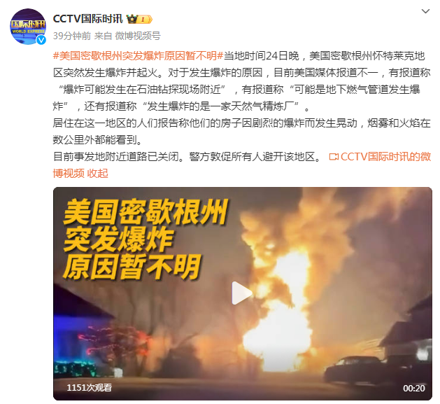 当地时间24日晚,美国密歇根州怀特莱克地区突然发生爆炸并起火。对于发生爆炸的原因,目前美国媒体报道不一,有报道称“爆炸可能发生在石油钻探现场附近”,有报道称“可能是地下燃气管道发生爆炸”,还有报道称“发生爆炸的是一家天然气精炼厂”。
