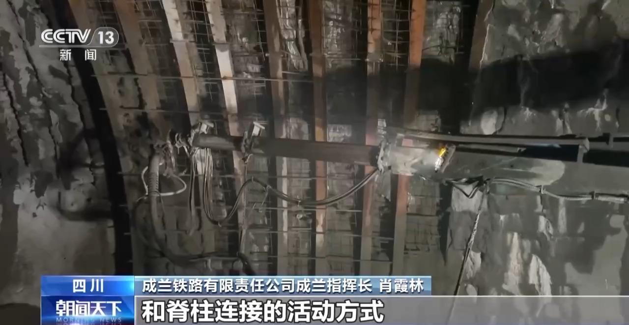 成兰铁路有限责任公司成兰指挥长 肖霞林:进行了一系列的抗震研究,为了适应地震错动,我在隧道衬砌的结构上,仿照动物的脊柱和脊柱连接的活动方式,采用了一个宽的变形缝,以便适应地震时,隧道结构有一定的上下左右的活动空间,最大限度地减少地震对隧道结构的影响和破坏。