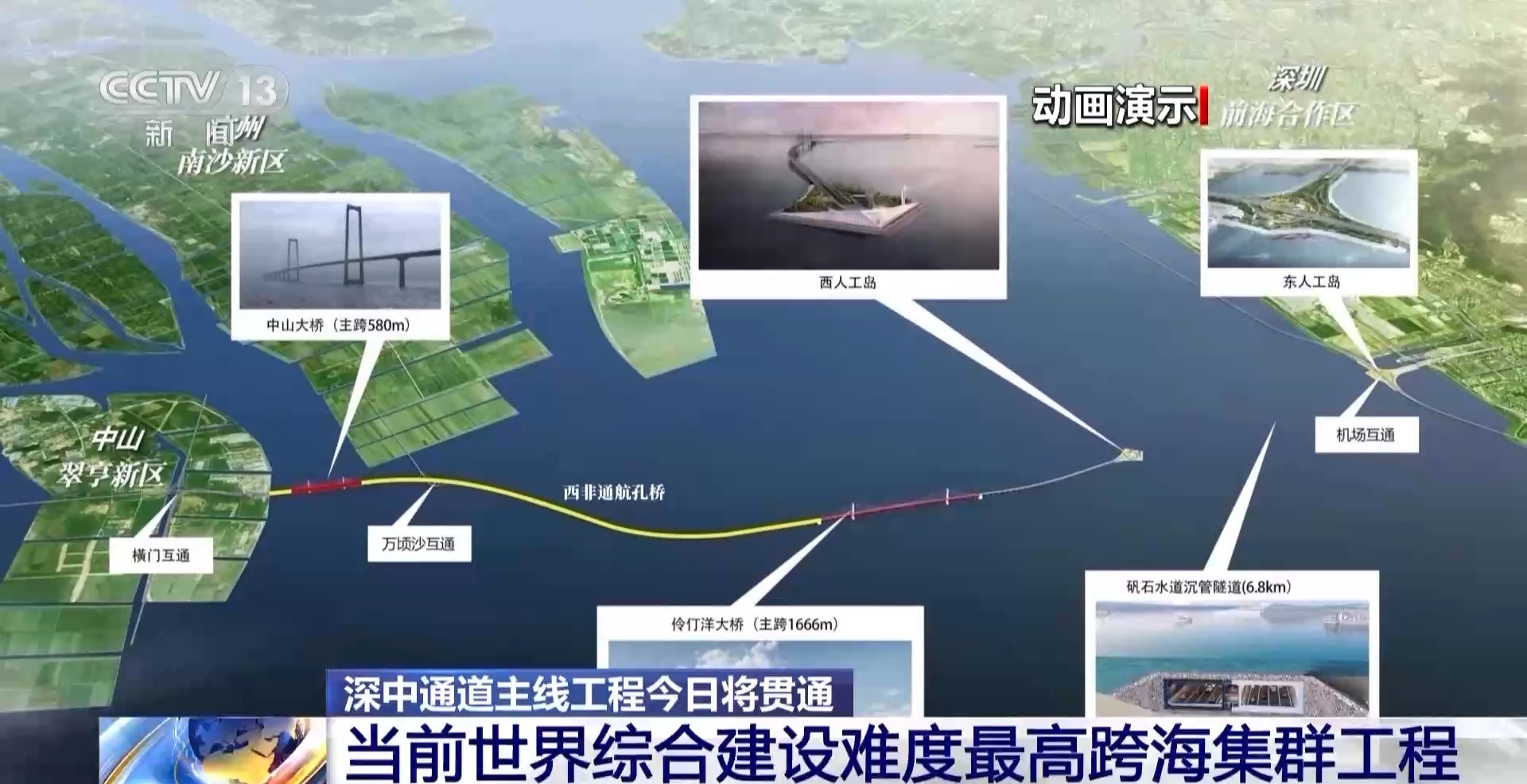 广东交通集团深中通道管理中心主任 总工程师 宋神友:未来,珠江西岸的人跟深圳机场以及前海实现快速交通转换,就是通过在东岸设置了一个高速公路在水下枢纽互通立交的形式,所以最终深中通道就是采用了桥岛隧水下枢纽互通于一体的跨海集群工程。