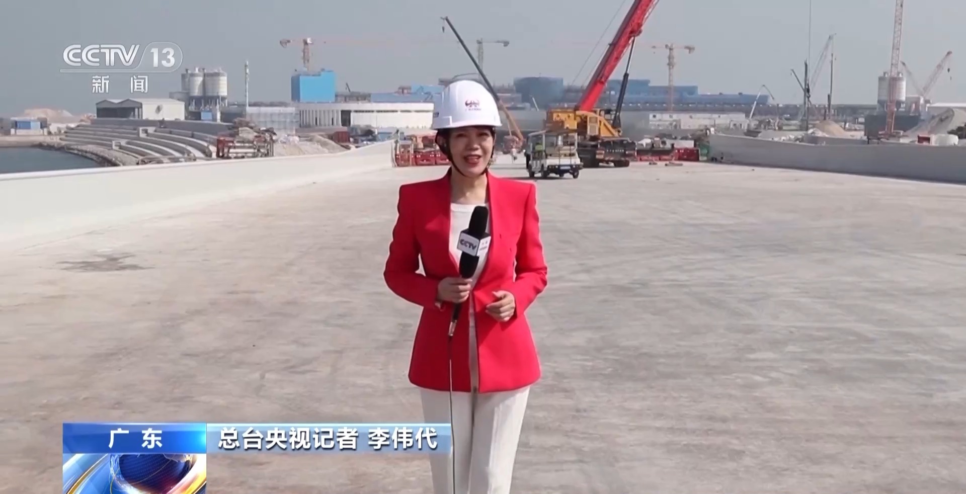 总台央视记者 李伟代:深中通道西人工岛,也是深中通道桥隧转换的关键的构造;从这里开始,深中通道开始了全长6845米的海底隧道部分,未来汽车将从这里驶向海平面之下,最深的地方将会在海平面之下39米的沉管隧道中行驶。