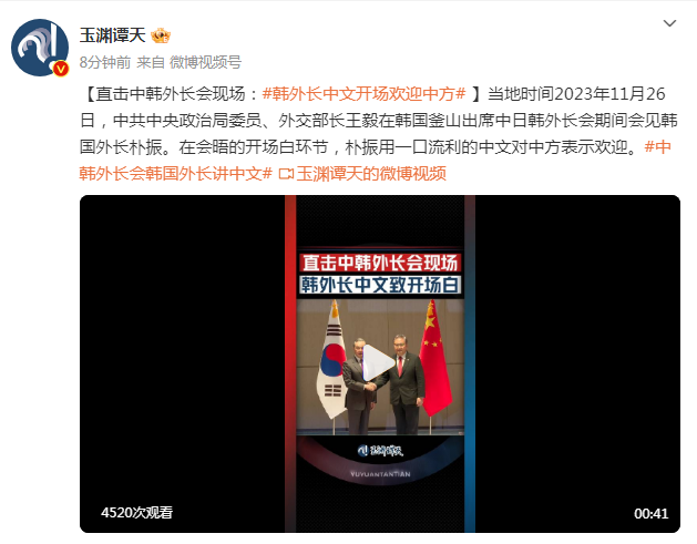 当地时间2023年11月26日,中共中央政治局委员、外交部长王毅在韩国釜山出席中日韩外长会期间会见韩国外长朴振。在会晤的开场白环节,朴振用一口流利的中文对中方表示欢迎。
