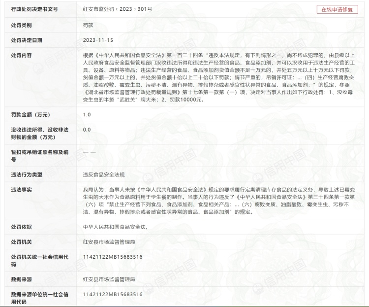 近日,湖北省红安县觅儿寺镇中心学校因使用霉变生虫的大米做学生餐,被红安县市场监督管理局开出1万元罚单。