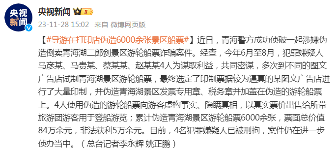 经查,今年6月至8月,犯罪嫌疑人马彦某、马贵某、蔡某某、赵某某4人为谋取利益,共同密谋,多次到不同的图文广告店试制青海湖景区游轮船票,最终选定了印制票据较为逼真的某图文广告店进行了大量印制,并伪造青海湖景区发票专用章、税务章并加盖在伪造的游轮船票上。4人使用伪造的游轮船票向游客虚构事实、隐瞒真相,以真实票价出售给所带旅游团游客用于登船游览;累计伪造青海湖景区游轮船票6000余张,票面总价值84万余元,非法获利5万余元。目前,4名犯罪嫌疑人已被刑拘,案件仍在进一步侦办当中。(总台记者李永辉 姚正鹏)