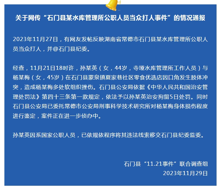 2023年11月27日,有网友发帖反映湖南省常德市石门县某水库管理所公职人员当众打人,并@石门县纪委。