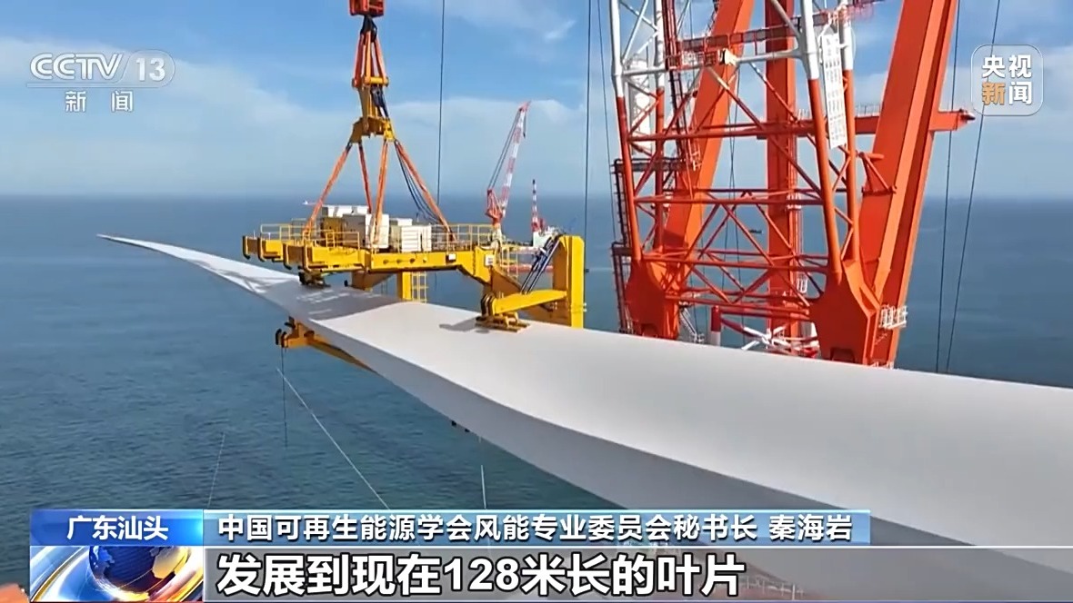 中国可再生能源学会风能专业委员会秘书长 秦海岩:我们现在已经批量生产16兆瓦的海上风电机组,马上18兆瓦的已经下线,叶片从原来四十几米长发展到现在128米长的叶片,这些都是在全球领先的。所以中国目前这个全套的产业体系从制造到建设到运维,我国已经形成完整的海上风电产业链。