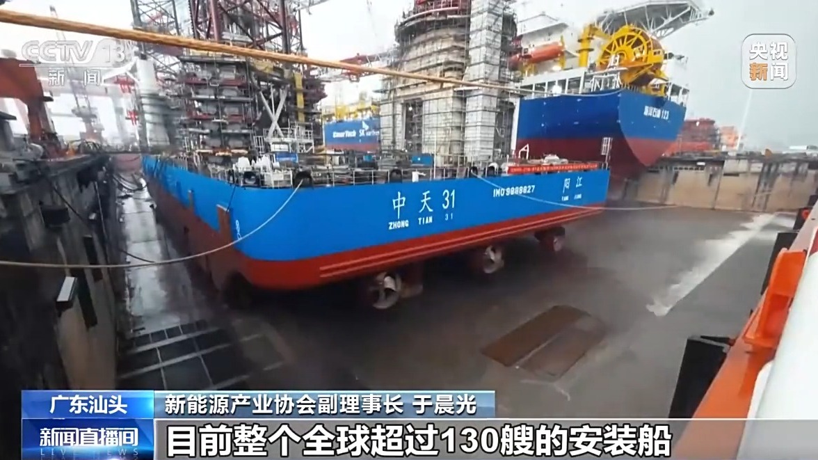 新能源产业协会副理事长 于晨光:海上风电安装船作为整个海上风电安装效率提升就是最重要的一个船机。目前整个全球超过130艘的安装船,中国造超过100艘,也就占了这80%以上的这个份额。目前高性能的安装船需求订单已经排到2028年,所以其实中国的这个安装船的市场可以走向欧美。