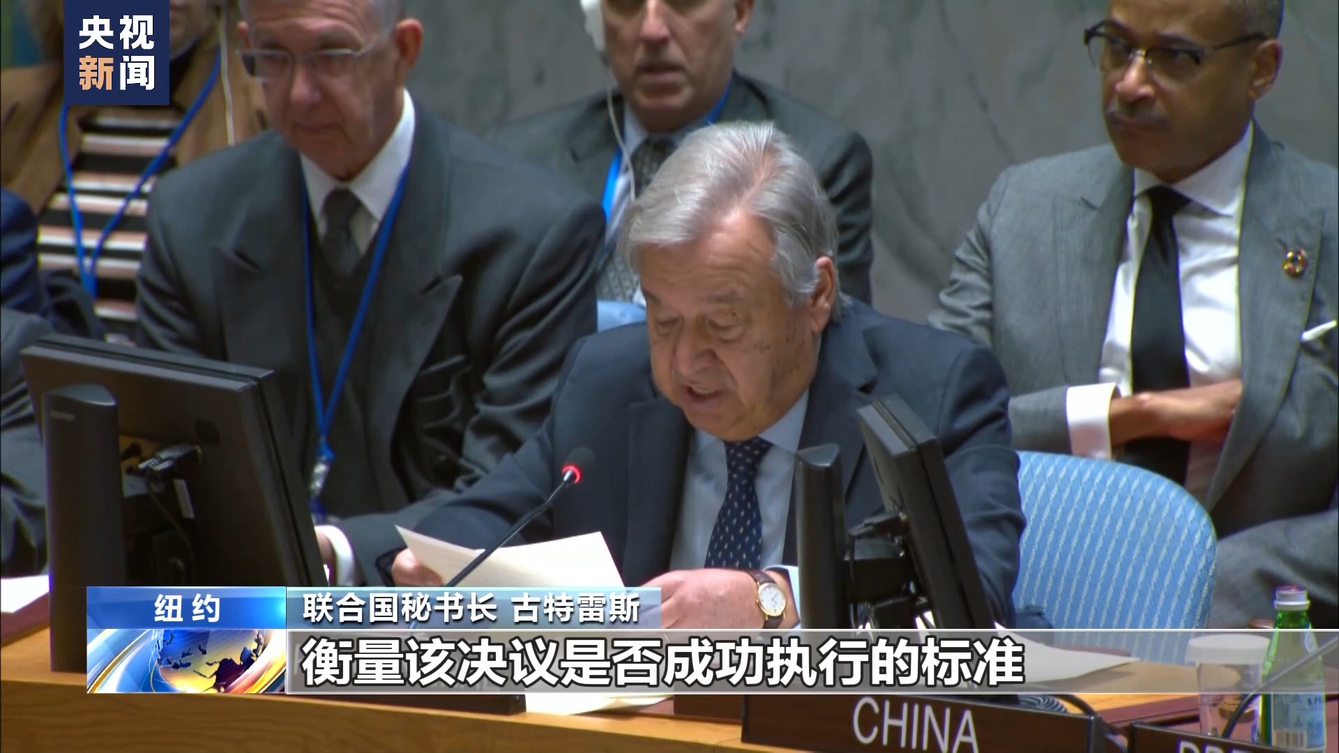 联合国秘书长 古特雷斯:我们知道,衡量该决议是否成功执行的标准不是我们派遣的人道主义救援物资、运输卡车数量或交付的物资吨数,虽然这些也很重要,但决议成功执行的标准是我们拯救的生命、结束的痛苦以及为当地恢复的希望和尊严。加沙民众正在经历一场人道主义灾难,我们不能对此视而不见。