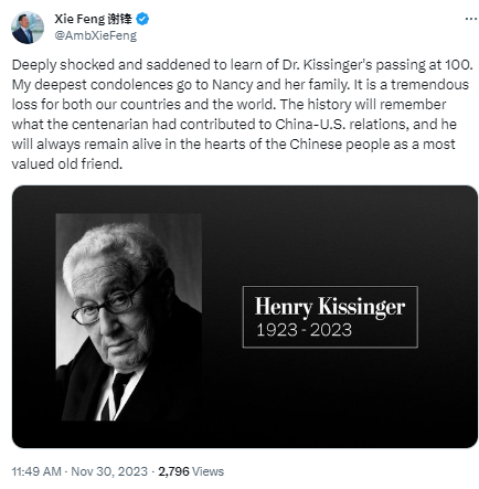谢锋在帖文中写道,“得知基辛格博士去世,享年100岁,深感震惊和悲痛。我向南希(基辛格夫人)和她的家人致以最深切的哀悼。这对我们两国和世界来说都是巨大损失。历史将铭记这位百岁老人为中美关系作出的贡献。作为一位最珍贵的老朋友,他将永远活在中国人民心中。”