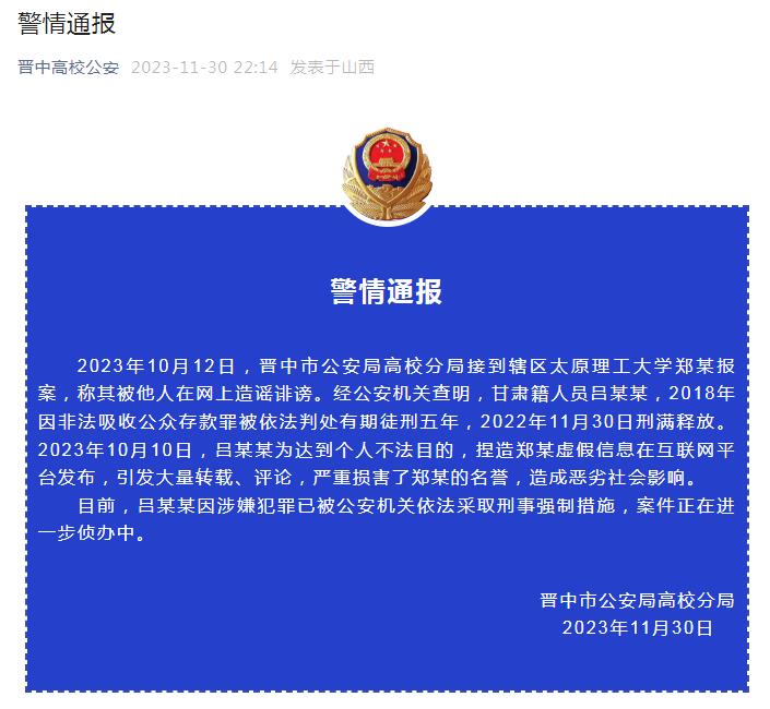 2023年10月12日,晋中市公安局高校分局接到辖区太原理工大学郑某报案,称其被他人在网上造谣诽谤。经公安机关查明,甘肃籍人员吕某某,2018年因非法吸收公众存款罪被依法判处有期徒刑五年,2022年11月30日刑满释放。2023年10月10日,吕某某为达到个人不法目的,捏造郑某虚假信息在互联网平台发布,引发大量转载、评论,严重损害了郑某的名誉,造成恶劣社会影响。