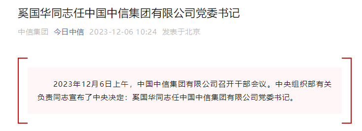 2023年12月6日上午,中国中信集团有限公司召开干部会议。中央组织部有关负责同志宣布了中央决定:奚国华同志任中国中信集团有限公司党委书记。