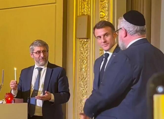 报道称,当天早些时候,马克龙在爱丽舍宫接受了一个颁发给与反犹主义作斗争的欧洲国家领导人的奖项。随后不久,社交媒体上传出的短视频引发争议。画面中,法国犹太教首席拉比科西亚在爱丽舍宫点燃蜡烛,马克龙则在一旁陪同观看。