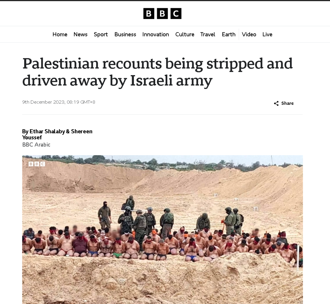 最后,从英国BBC的一篇最新报道来看,那些加沙地区的巴勒斯坦男子之所以会被扒光和反手拷住并跪在地上,是因为以色列军方怀疑这些男子可能是哈马斯的成员,所以在对他们进行搜查和审问。