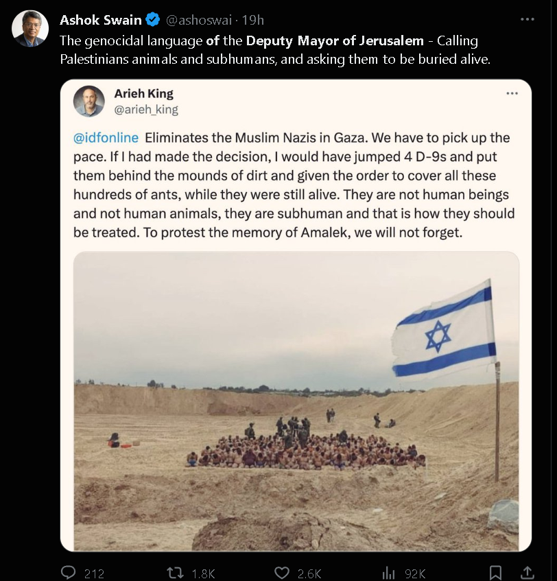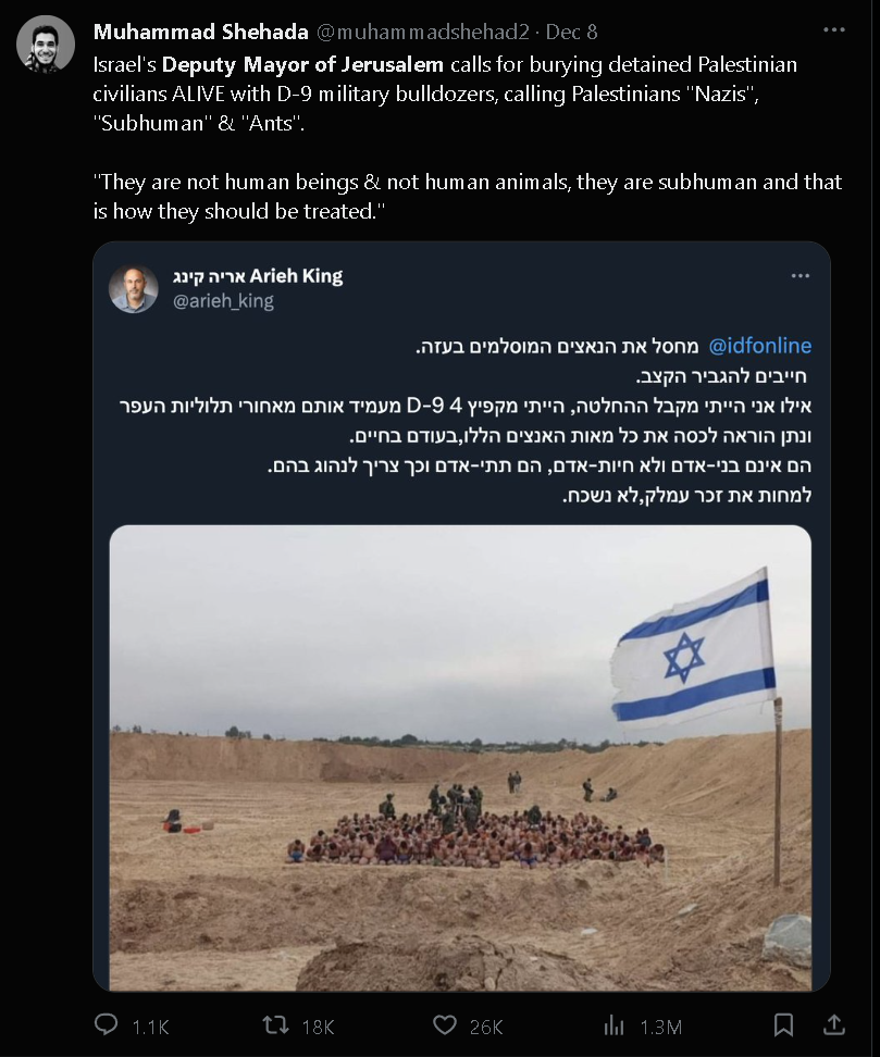 这名持右翼政治立场的副市长甚至在帖文中表示,如果让他来负责此事,他会直接用“推土机”将这些巴勒斯坦男子“活埋”,并称这些巴勒斯坦人“不是人”,所以不配得到人类那样的对待。