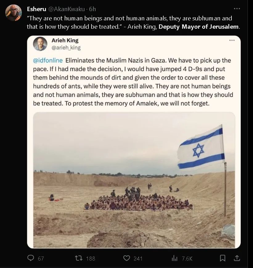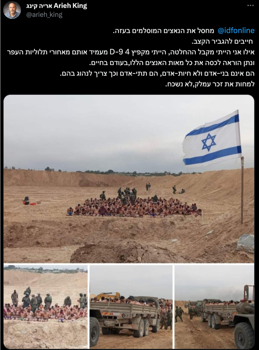 如下图所示,在这则用希伯来语撰写的帖文中,耶路撒冷市副市长Aryeh King不仅称图中被扒光衣服,被反手拷住并跪在地上的众多巴勒斯坦男子为“纳粹”分子,还要求他们身边的以色列军方加速“清除掉”这些人。