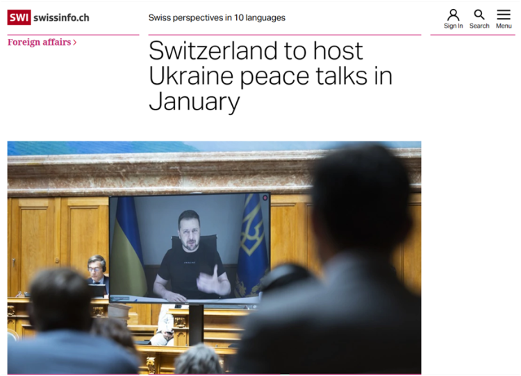 10月28日,旨在结束乌克兰危机的第三次和平会谈在马耳他举办,12月初,泽连斯基曾在记者会上表示将召开第四次和平会谈,地点可能会在瑞士。而据“瑞士资讯”报道,瑞士外交部向媒体确认了会谈将在瑞士举办的消息,并表示乌方计划的会谈时间为2024年1月14日,这天也是达沃斯世界经济论坛开幕的前一天。