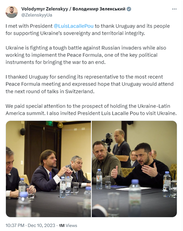 10日,泽连斯基在阿根廷参加新任总统米莱的就职典礼期间,与米莱及乌拉圭、巴拉圭和厄瓜多尔总统分别举行会谈,讨论举行乌克兰—拉丁美洲峰会的可能性及其他合作项目等。当天在社交媒体平台谈及和乌拉圭总统的会面时,泽连斯基表示,他希望乌拉圭总统也能参加明年1月在瑞士举办的和平会谈。