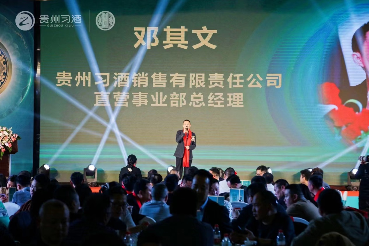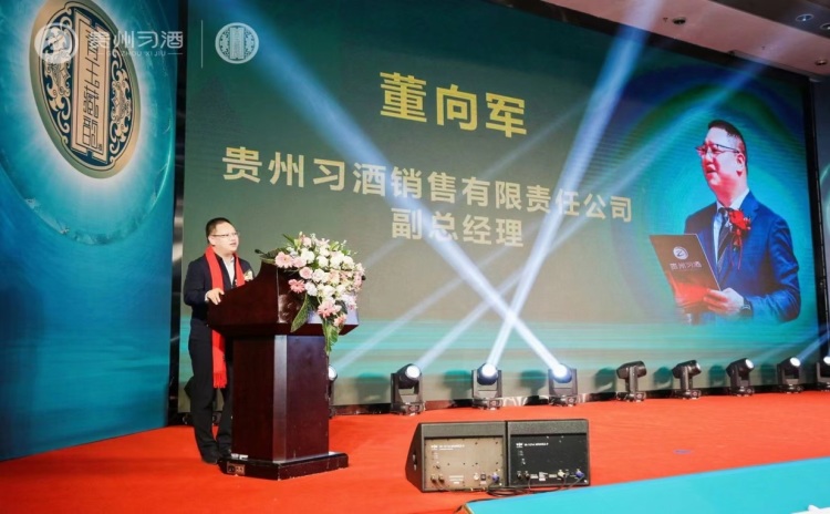 贵州习酒销售有限公司直营事业部总经理邓其文代表习酒致祝酒辞,对习酒青玉藏韵·匠心以玉为器,璀璨通透,熠熠生辉;以酒为魂,酒匠之美,品质齐飞,最终造就了习酒青玉藏韵·匠心的君子品格。他举起酒杯,在台上带领与会嘉宾共同感受习酒文化,喊出了那句经典的习酒口号---“习酒,一二三 干”!