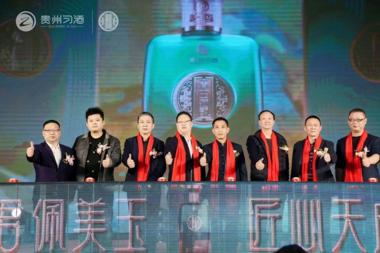 新品发布环节把整个会议的气氛推到了最高潮,在贵州习酒销售有限责任公司副总经理董向军、贵州酒文化研究会会长梁正、河南云飞酒业董事长仝伟、天高控股集团 川发展/中国白酒金三角品牌运营公司董事长韩志超、贵州习酒销售有限责任公司直营事业部总经理邓其文、华致酒行酒频道副总裁张洋、湖南铭姚商贸有限公司董事长王中洲、贵州君贤汇酒业有限公司董事长陈康康8人的共同见证下,在众人的倒数声中,随着启动键的按下,习酒青玉藏韵·匠心正式上市。