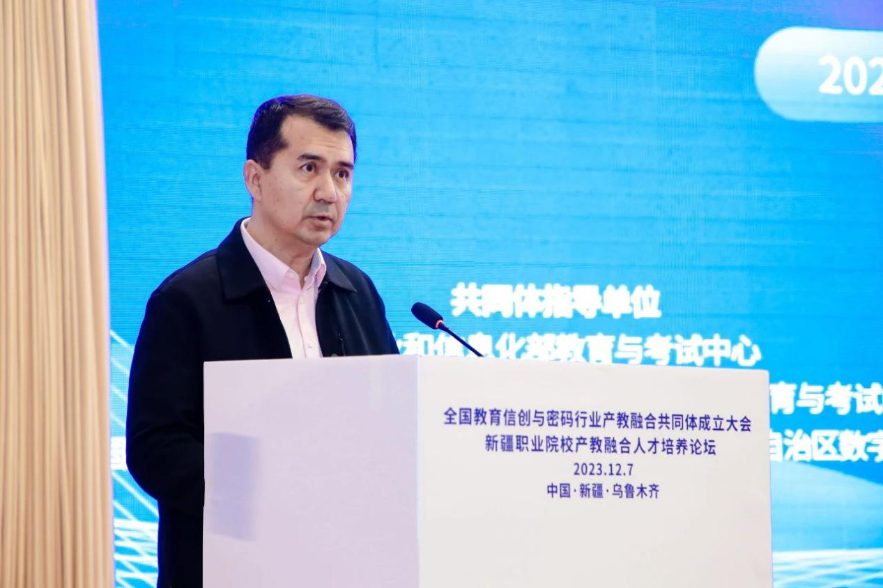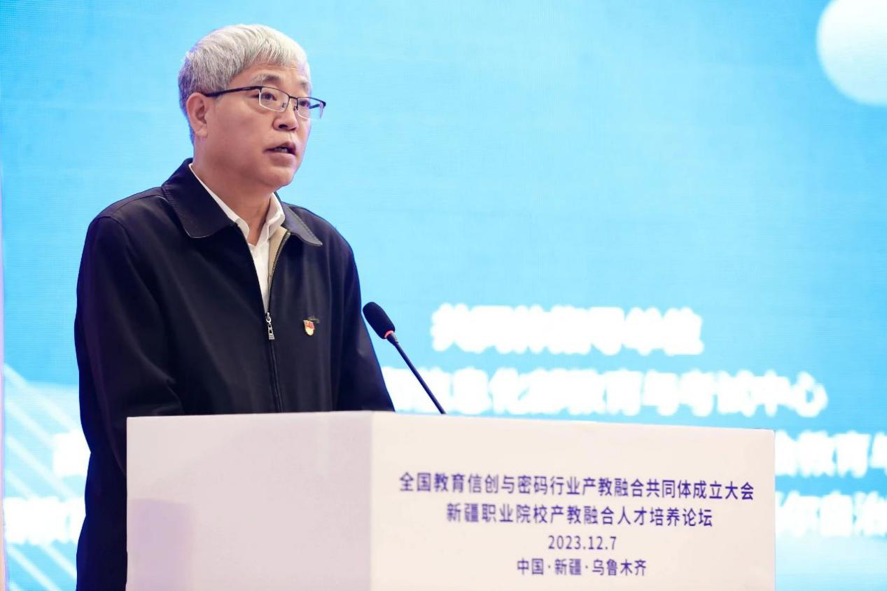新疆维吾尔自治区人民政府总督学、自治区教育厅党组成员孙长波发表了致辞。他提到,随着信息技术的飞速发展,密码应用领域不断拓展,信息安全已成为国家安全、社会稳定、经济发展等方面的重要保障,密码技术与新技术、新领域的融合愈发密切与广泛,信创与密码行业的发展显得尤为重要。成立全国教育信创与密码行业产教融合共同体,旨在搭建政府、行业、企业、院校协作发展平台,促进教育链、产业链、人才链和创新链的有机融合,创新产教融合、校企合作体制机制,加强校企、校校深度合作,加快教育信创与密码行业高素质技术技能人才培养培训,为新疆乃至全国教育信创与密码行业发展提供智力和人才的支撑。通过共同体的建设,产教双方共同带动信息技术相关方面的创业创新和产业升级,有效促进行业发展和教育改革,为科技进步和产业变革提供大批高素质信创与密码行业技术人才,在推进中国式现代化的进程中做出新的更大贡献。
