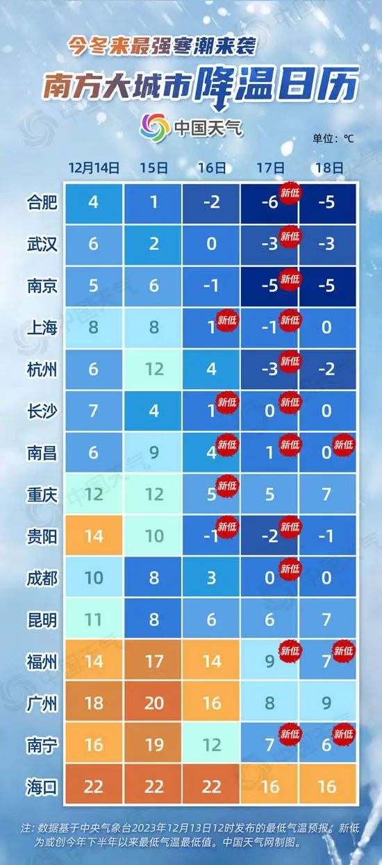 从南方大城市降温日历来看,14日至18日,合肥、武汉、南京、上海、杭州、贵阳最低气温都将逐步下降到冰点以下。南昌16日至18日最低气温或连创新低,贵阳最低气温将从14℃降至-2℃,降幅可达16℃。