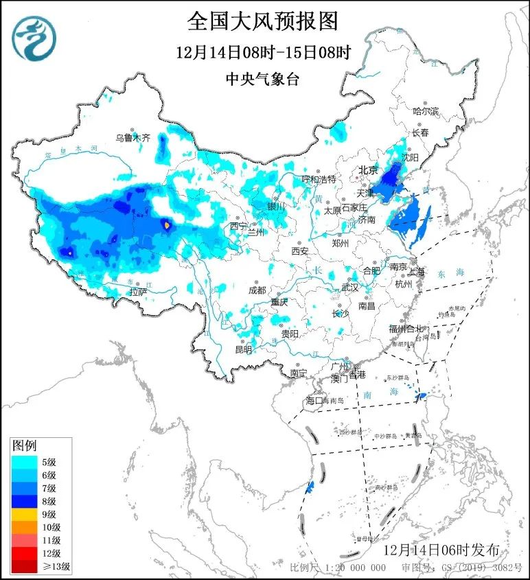 中央气象台14日6时继续发布大风蓝色预警,预计14日8时至15日8时,新疆东部和南疆盆地、西藏西部、宁夏、青海、内蒙古中西部等地部分地区有5~6级、阵风7~8级的大风,其中,新疆山口地区、青海西部、西藏西北部等地部分地区有7~8级、阵风9~10级的大风;渤海、渤海海峡、黄海西部的部分海域将有7~8级、阵风9级的大风。