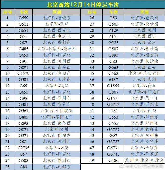 受降雪影响,14日,北京西站、北京丰台站、北京南站部分列车临时停运,已购买停运列车车票的旅客,可于30日内办理全额退票手续。请广大旅客合理安排出行,关注车站公告或12306网站信息。
