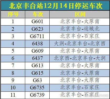 另据北京北站消息,14日,北京北站D6711次、D6713次、D6703次、D6709次,清河站D6715次、D6717次、D6701次、D6705次、D6707次,延庆站D6702次、D6704次、D6706次、D6708次、D6710次列车停运。