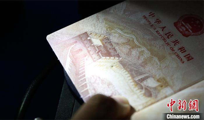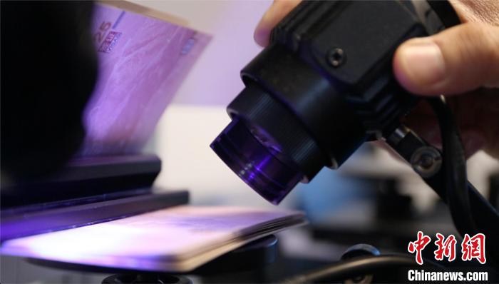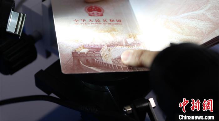 图为护照在比对显微镜下,用侧光观察护照下方的防伪标志。高莹 摄