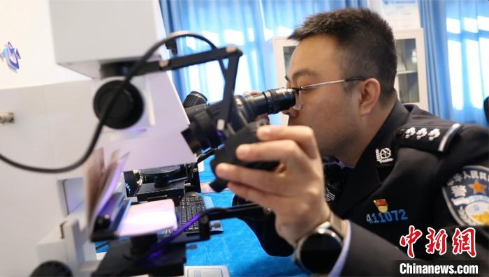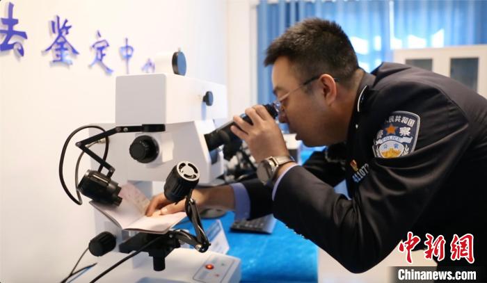 民警正在使用比对显微镜对护照进行鉴别。高莹 摄