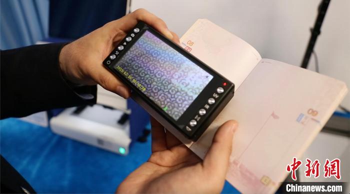 图为民警使用便携式多光谱电子文检仪,将仪器贴在证件上,可以完整清晰地看到证件的底纹等信息。高莹 摄