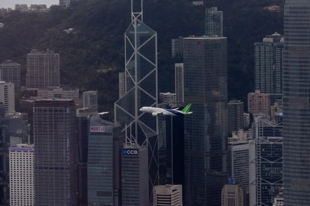 今日(16日),国家自主研制的C919飞机于上午10:30从香港国际机场起飞,由西至东进入及飞越维港上空,环绕香港岛两圈,进行飞行演示。现场所见,天色晴朗及有阳光,C919在维港上空翱翔,融入维港景色。