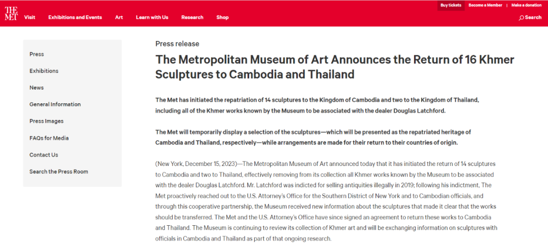 据纽约大都会博物馆发布的公告,本次归还的文物总计16件,其中14件属于柬埔寨,另外2件属于泰国。这些文物包括原存放于柬埔寨国戈寺10世纪乌玛女神雕像,这尊雕像被柬埔寨人称为“我们祖先的灵魂”,但随着国戈寺自19世纪开始被法国探险者等各方势力入侵破坏,雕像被掠夺后辗转流向大都会博物馆。