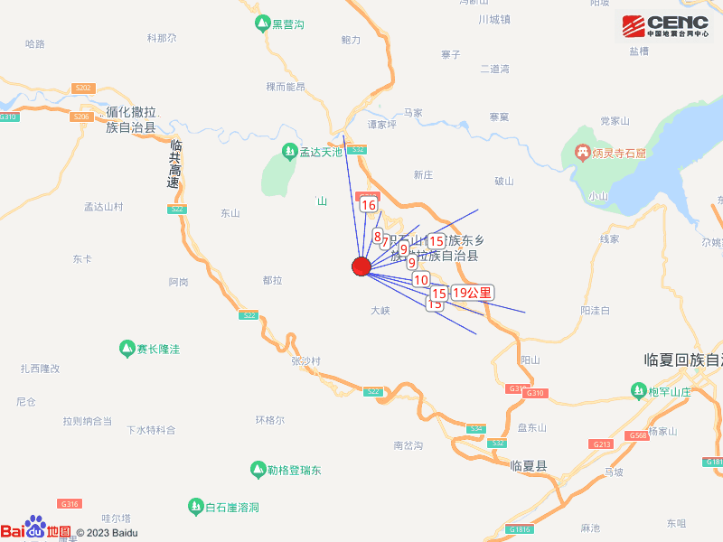 震中距积石山保安族东乡族撒拉族自治县8公里、距青海循化撒拉族自治县32公里、距临夏县34公里、距临夏市42公里、距永靖县53公里,距临夏回族自治州40公里,距兰州市102公里。