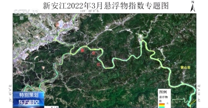 这是新安江的卫星影像,展示的是2010年3月与2022年3月,反映水质的悬浮物指数的变化,十几年间由表示较高值的黄色变成了绿色,降低了57.97%。