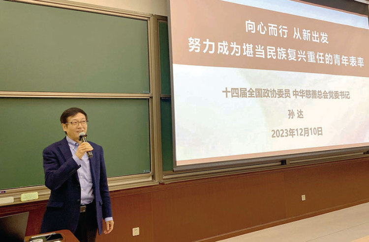 慈善公益报(李济慈)近日,清华大学第二教学楼大教室里座无虚席,一场别开生面的党课正在这里开讲。第十四届全国政协委员、中华慈善总会党委书记孙达作为主讲人,与清华大学多个专业新入学的入党积极分子进行深入交流,并作了题为“向心而行 从新出发 努力成为堪当民族复兴重任的青年表率”的主题授课,在全体与课同学中引起热烈反响。