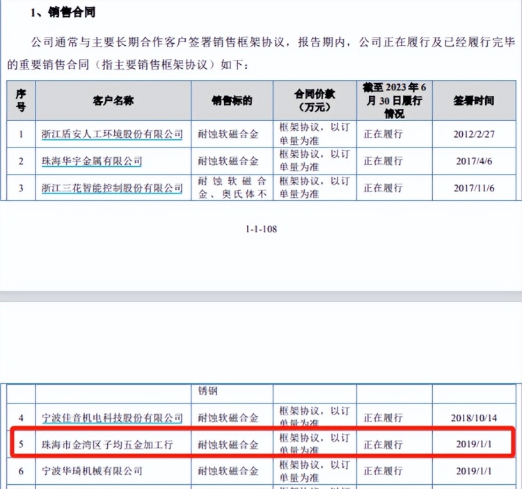 招股书第108页披露,公司通常与主要长期合作客户签署销售框架协议,报告期内公司正在履行及已经履行完毕的重要销售合同中,包括有与“珠海市金湾区子均五金加工行”在2019年1月签订的框架协议,且该合同截止到2023年6月末的状态为“正在履行”。但是根据《国家企业信用信息公示系统》查询显示,“珠海市金湾区子均五金加工行”已于2022年4月注销,至于公司会与一家已经不存在的公司保持框架协议“正在履行”的原因,金则利并未接受记者采访。