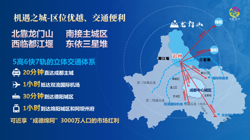彭州区位优势明显,交通便利,处于成渝地区双城经济圈发展主轴和成都都市圈核心。通过5高6快7轨的立体交通体系,可以轻松实现20分钟直达成都主城、1小时抵达双流国际机场,特别是随着成德市域铁路S11线、天府大道北延线、成汶高速的建成通车,让彭州可以30分钟连接德阳城区、1小时连接绵阳城区和阿坝州府,可近享“成德绵阿”3000万人口的市场红利。