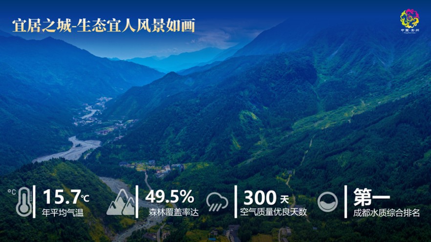 生态宜人风景如画。彭州年平均气温15.7℃,森林覆盖率达49.5%,全年空气优良天数超300天。彭州有高山、浅丘、水域、平原,集聚了国家地质公园、国家森林公园等5个国家级品牌、3个4A级旅游景区,自成一副天然的立体山水画卷。目前,彭州市已打造出中法白鹿音乐小镇、中国三大牡丹花会之一的天彭牡丹花会、宝山国际旅游度假区等特色各异的旅游场景,形成了“东有浙江莫干山,西有四川龙门山”的民宿IP,每年吸引游客超过1800万人次。
