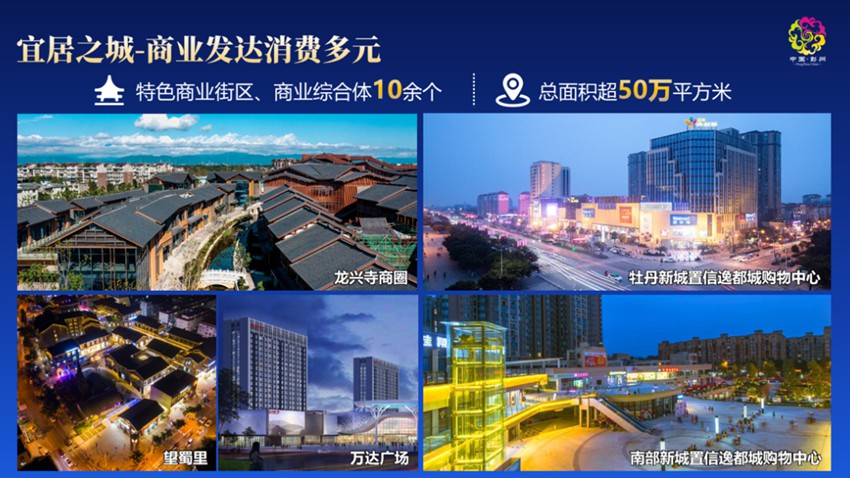 商业发达消费多元。彭州建有万达广场、置信逸都城购物中心、望蜀里、龙兴寺等特色商业街区、商业综合体10余个,总面积超50万平方米。加上九尺美食城、桂花陶艺村等特色消费场景,吸引着大量外来人员来彭消费。