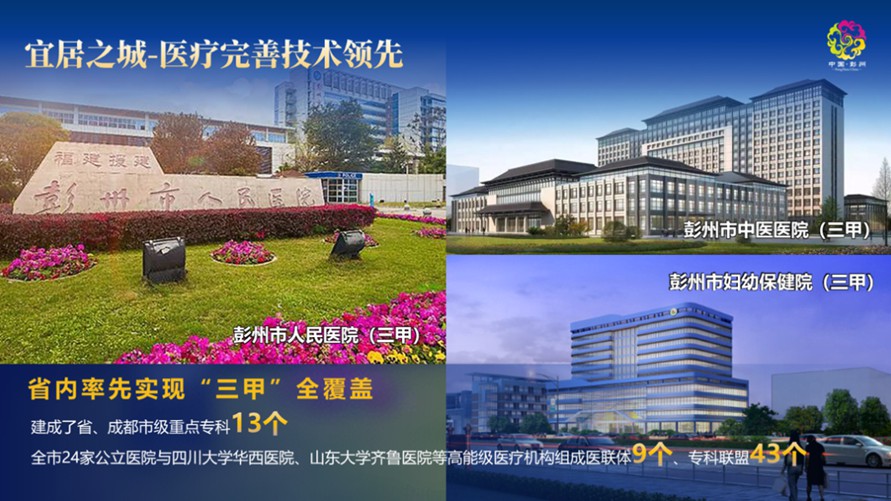 医疗完善技术领先,彭州市人民医院、妇幼保健院、中医医院均为“三甲”医院,四川省128个(市)县中仅此一家。建成了省、成都市级重点专科13个,全市24家公立医院与四川大学华西医院、山东大学齐鲁医院等高能级医疗机构组成医联体9个、专科联盟43个。同时,彭州与成都中医药大学、西南医科大学等医科高校达成合作,正全力打造成都都市圈北部医疗中心。