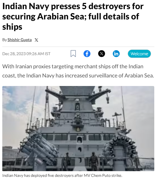 据报道,印度海军将加尔各答号驱逐舰、科钦号驱逐舰、莫尔穆冈号驱逐舰和金奈号驱逐舰分别部署在红海出口、也门索科特拉岛以南、阿拉伯海西部及中部。另将维沙卡帕特南号驱逐舰安排在阿拉伯海北部巡逻。