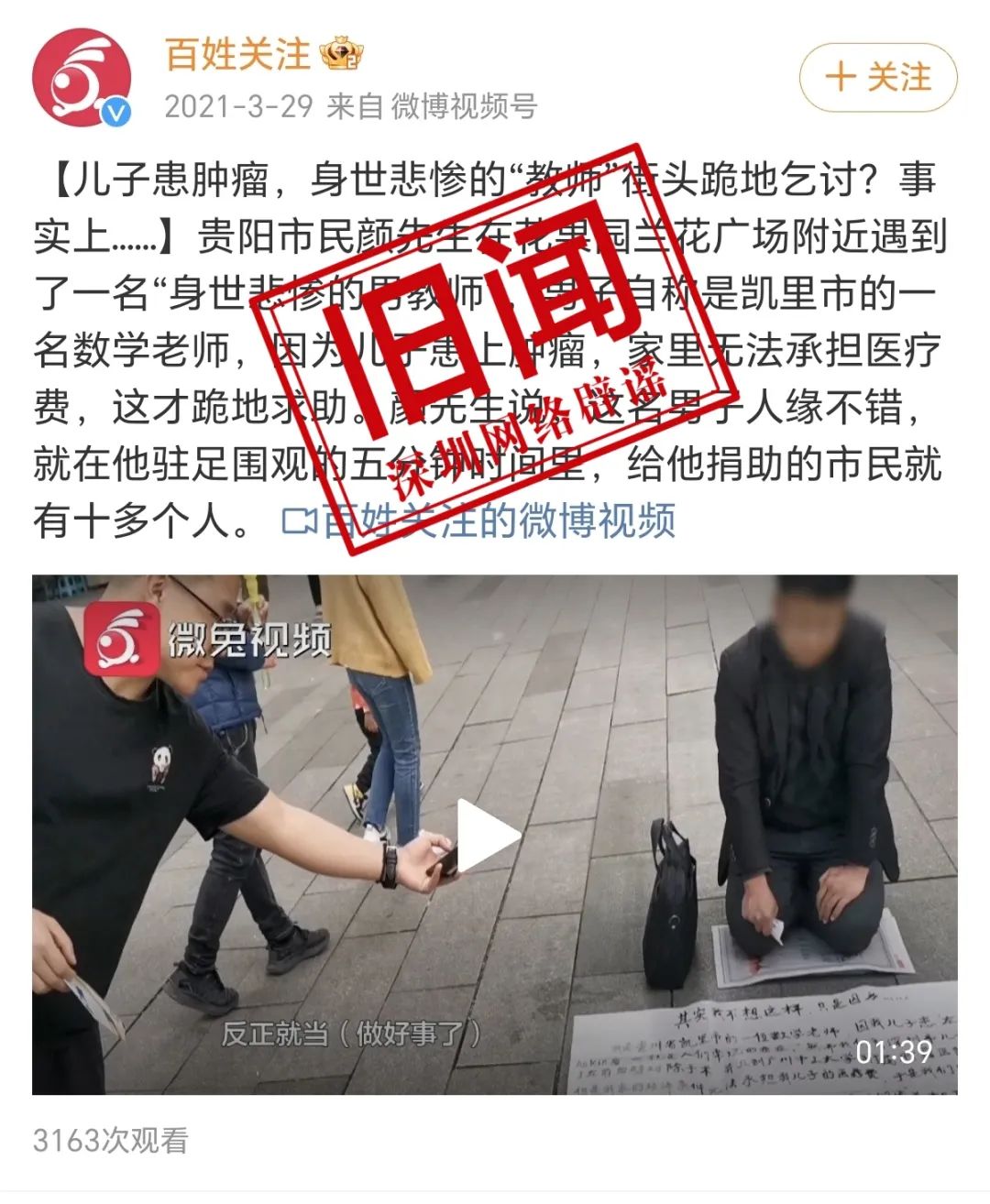 12月27日,多网帖发布“深圳一中年数学教师为救重病儿子而跪地乞讨”的内容,相关图片中,一位身着西装的男子当街跪地,面前摆着乞讨用的纸板文案、收款二维码等物品。经核实,该情况不属实。同时,经网上对比,帖文中该男子乞讨所用的纸板文案,与2021年一媒体报道外地“跪地男教师”事件中的纸板文案一致。