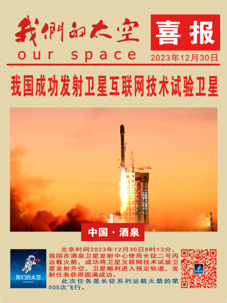 北京时间2023年12月30日8时13分,我国在酒泉卫星发射中心使用长征二号丙运载火箭,成功将卫星互联网技术试验卫星发射升空,卫星顺利进入预定轨道,发射任务获得圆满成功。