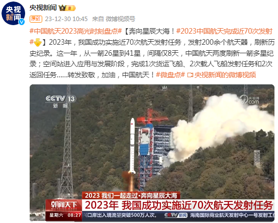 2023年,我国成功实施近70次航天发射任务,发射200余个航天器,刷新历史纪录。这一年,从一箭26星到41星,间隔仅8天,中国航天两度刷新一箭多星纪录;空间站进入应用与发展阶段,完成1次货运飞船、2次载人飞船发射任务和2次返回任务……加油,中国航天!