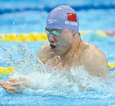 中国选手覃海洋在杭州亚运会游泳项目男子50米蛙泳决赛中获得冠军。新华社记者 黄宗治摄