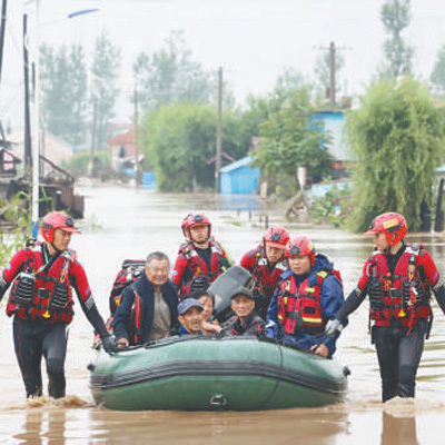 在黑龙江省尚志市一面坡镇万山村,消防员将被困群众转移至安全地域。杨铁岩摄(新华社发)