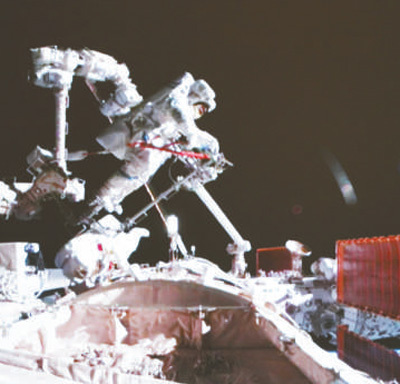 在北京航天飞行控制中心拍摄的神舟十六号航天员景海鹏(上)、朱杨柱开展舱外操作的画面。新华社记者 郭中正摄