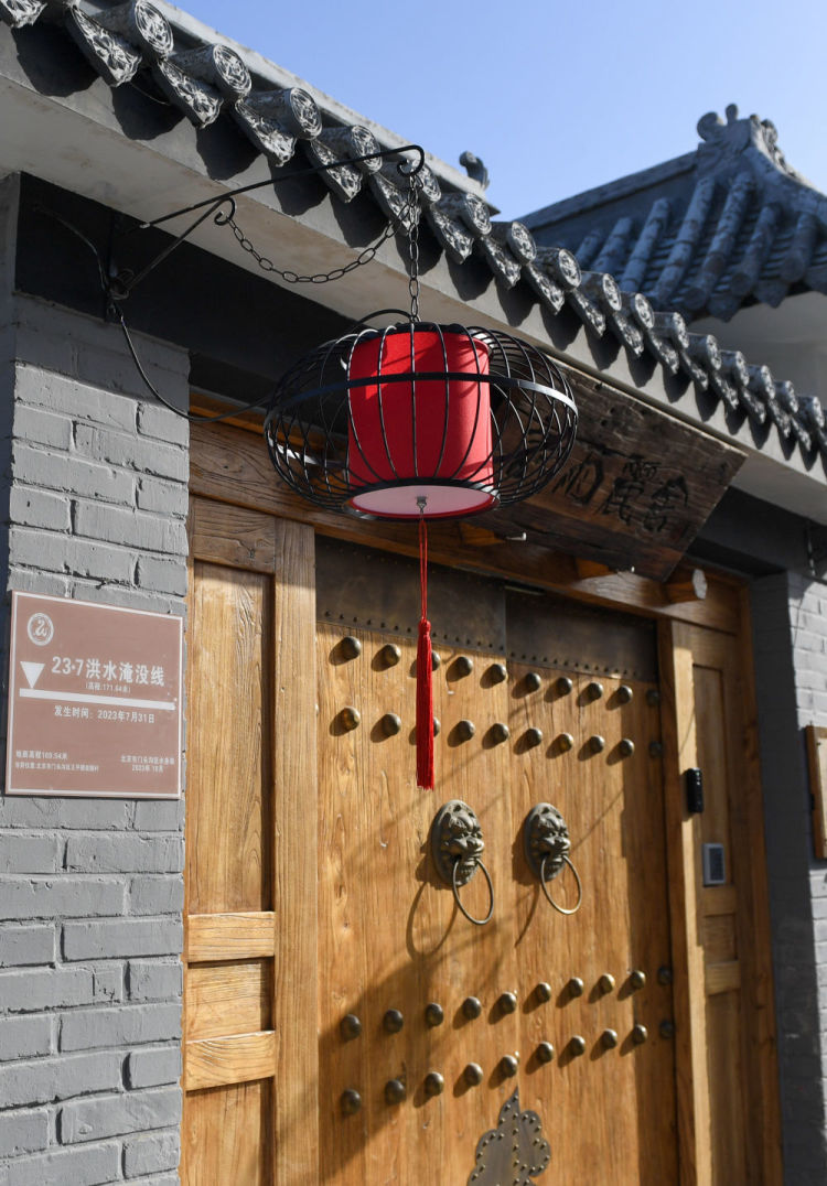 在北京市门头沟区王平镇韭园村,一家恢复营业的民宿门前挂着标有受灾时洪水淹没线的标牌(12月7日摄)。新华社记者 鞠焕宗 摄